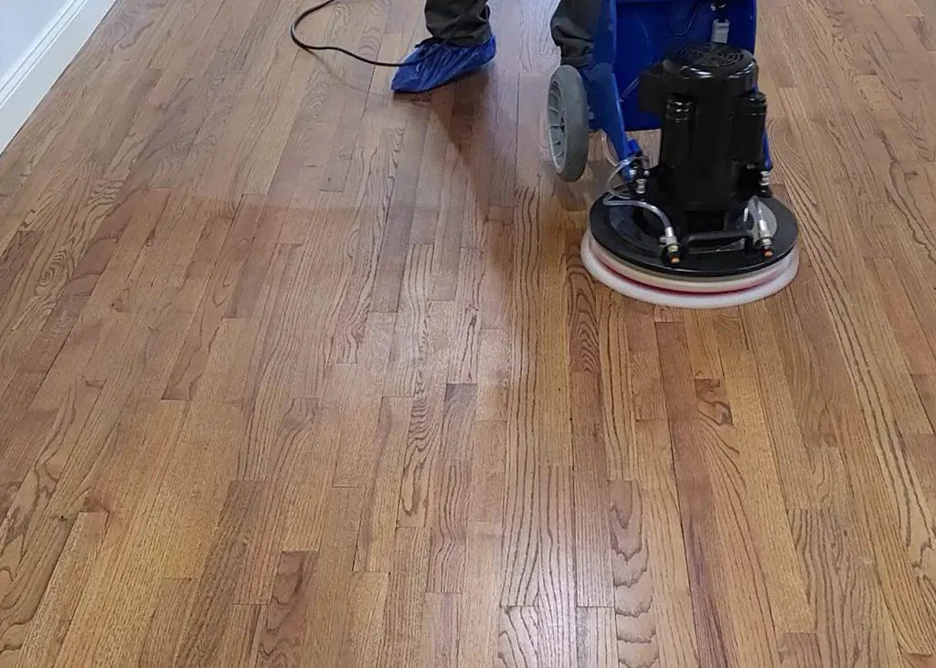 We begin by thoroughly cleaning and preparing your floors to remove residue, oils, and surface contaminants. This ensures a smooth, even bond between the existing finish and the new coat
